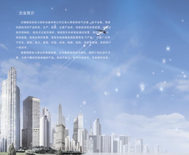 安徽徽凱創(chuàng)電力保護(hù)設(shè)備有限公司主要從事新型電氣設(shè)備、電子設(shè)備、智能控制技術(shù)的產(chǎn)品研發(fā)、生產(chǎn)、銷售。主要產(chǎn)品有:智能型消弧消諧裝置、消諧過(guò)電壓抑制柜、 組合式過(guò)電壓保護(hù)、智能型開(kāi)關(guān)柜智能操控裝置、微機(jī)消諧、小電流選線、電弧光保護(hù)裝置、智能在線絕緣監(jiān)測(cè)裝置等電氣產(chǎn)品。 產(chǎn)品廣泛用于石化、煤炭、電力、建筑、市政、機(jī)場(chǎng)、鐵路、醫(yī)院、學(xué)校等領(lǐng)域,受到用戶一致好評(píng)。